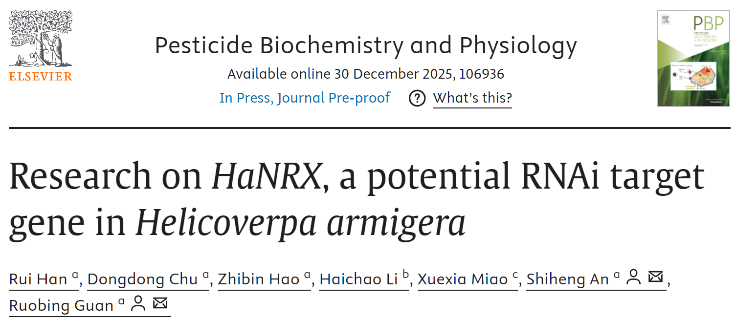 近期,我院安世恒教授团队在《Pesticide Biochemistry and Physiology》发表了题为“Research on HaNRX, a potential RNAi target gene in Helicoverpa armigera”的研究论文。该研究揭示棉铃虫中HaNRX基因可作为RNA生物农药防治棉铃虫的高效潜在靶标,并系统评估了植物介导RNAi技术在害虫绿色可持续防控中的可行性与应用潜力。研究成果为棉铃虫绿色综合防控策略提供了新的理论与技术依据。